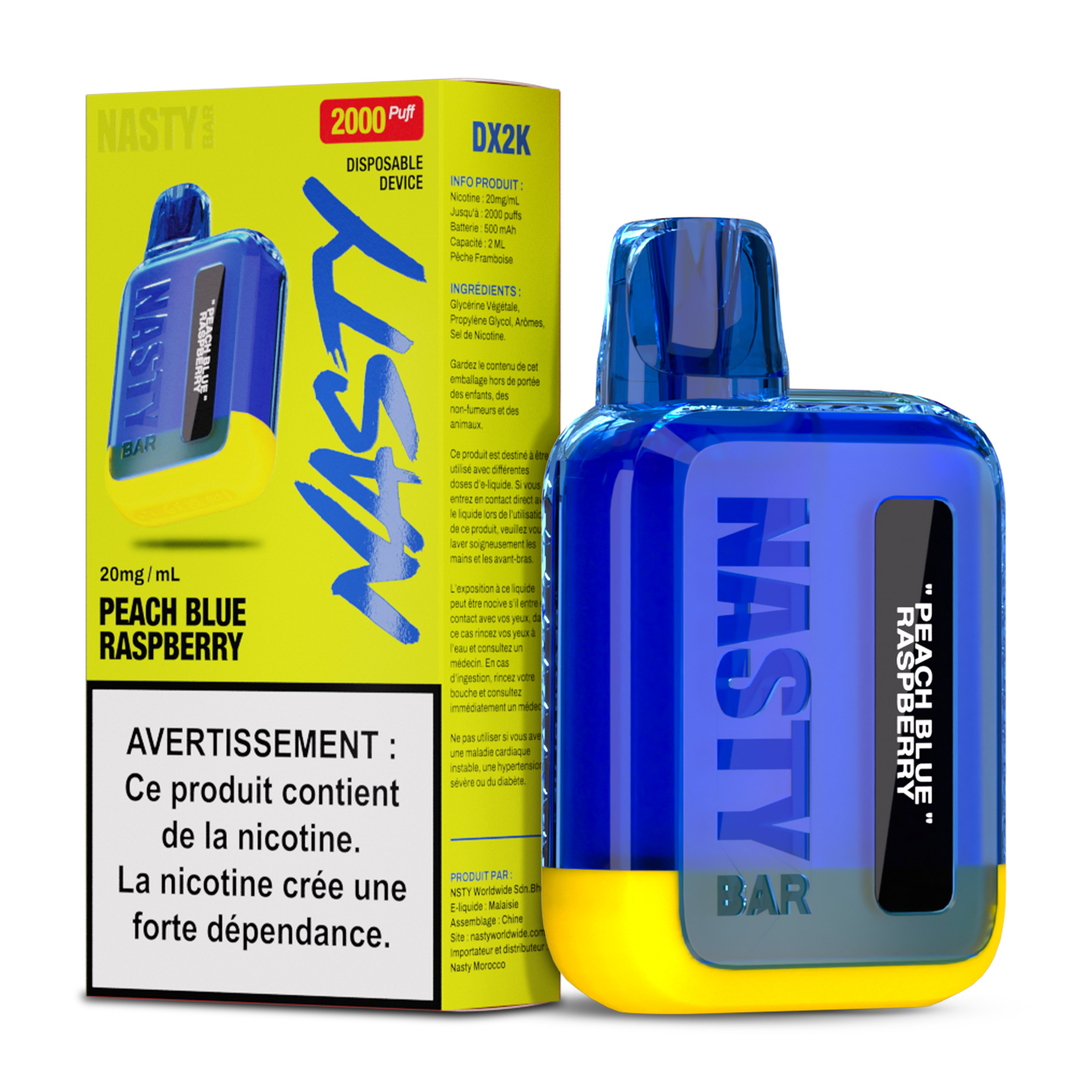 Nasty DX2K Peach Blue Raspberry 20mg : puff jetable compact, saveur pêche framboise bleue, mesh coil 1.4 ohm, batterie 500 mAh et 2000 puffs.